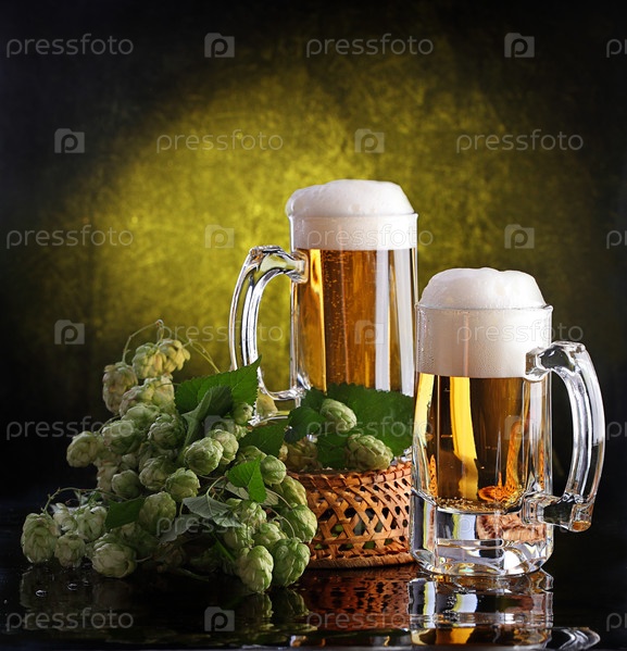 Две кружки пива с веткой хмеля