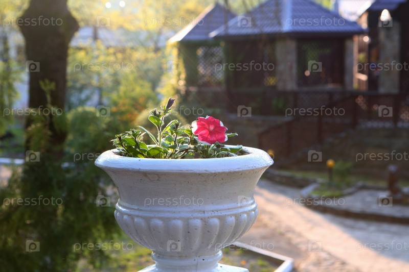 Красивый белый горшок с малиновой петунией (латинская петуния) в парке в солнечный летний день