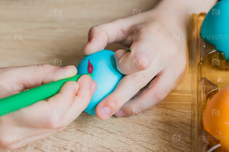 Детская ручная роспись пасхального яйца фломастером. Крупным планом