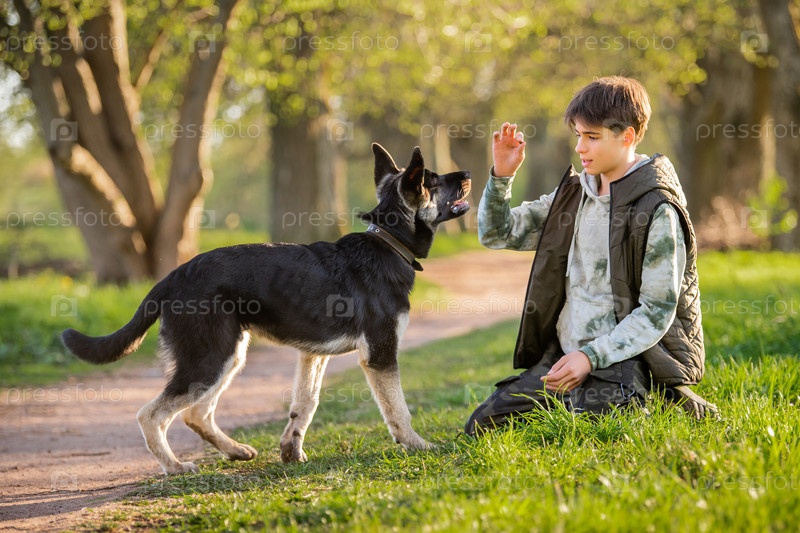 Мальчик с собакой гуляет в парке солнечным весенним вечером, сидит на траве, собака подчиняется приказу дать лапу. Дружба человека и животного, здоровый образ жизни