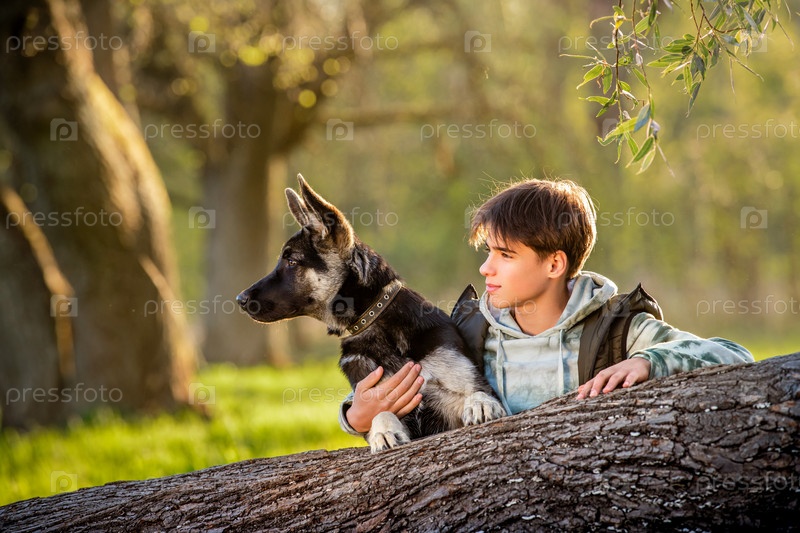 Мальчик с собакой гуляют в парке солнечным весенним вечером, сидят на траве. Дружба человека и животного, здоровый образ жизни