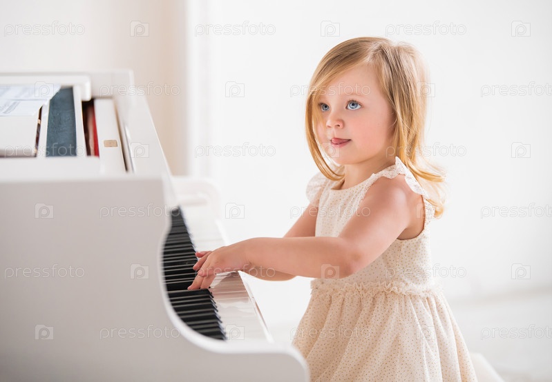 Маленькая девочка играет на большом белом пианино в яркой солнечной комнате