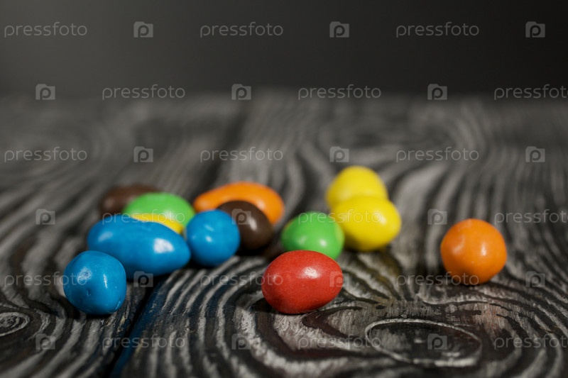 Шоколадные конфеты в разноцветной глазури. Разбросаны по черным сосновым доскам. Крупный план
