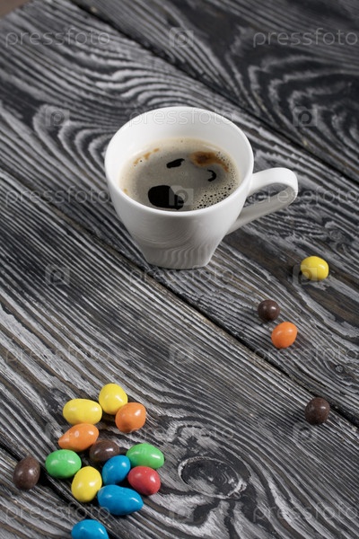 Чашка черного кофе в белой чашке. Шоколадные конфеты в глазури. На сосновых досках