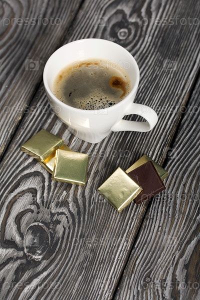 Чашка черного кофе в белой чашке. Шоколад в фольге. На сосновых досках
