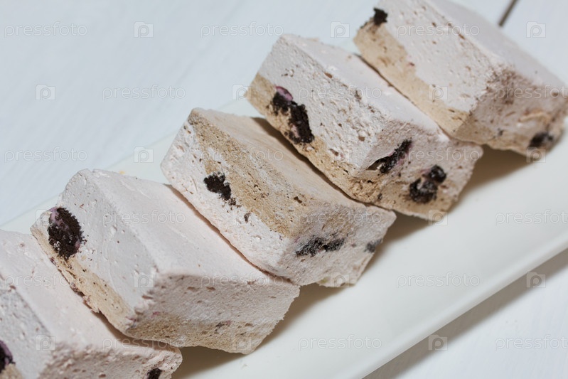 Домашний зефир на подносе. На белом фоне. Крупный план