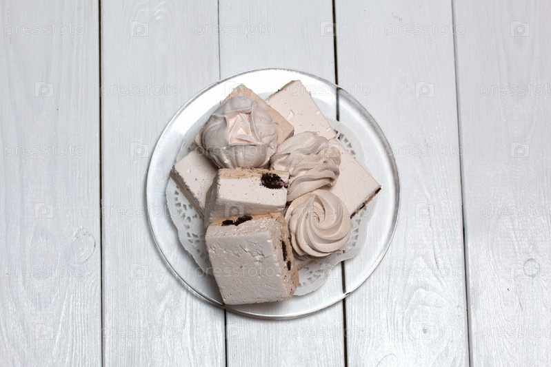 Домашний зефир на подносе. На белом фоне. Крупный план