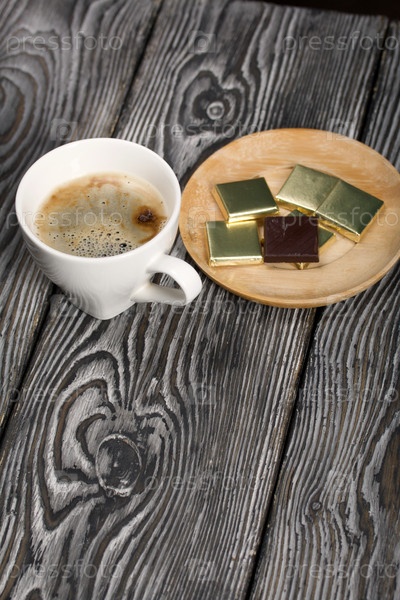 Чашка черного кофе в белой чашке. Шоколад в фольге. На сосновых досках