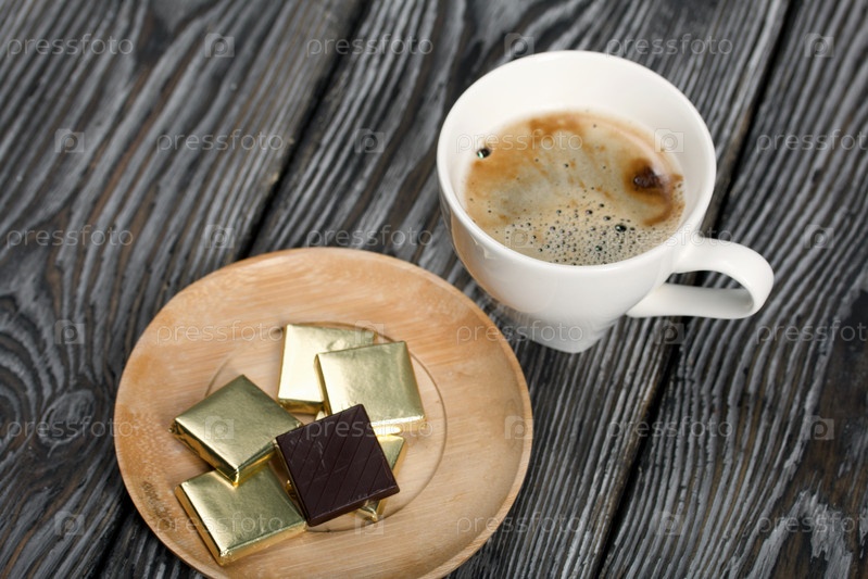 Чашка черного кофе в белой чашке. Шоколад в фольге. На сосновых досках