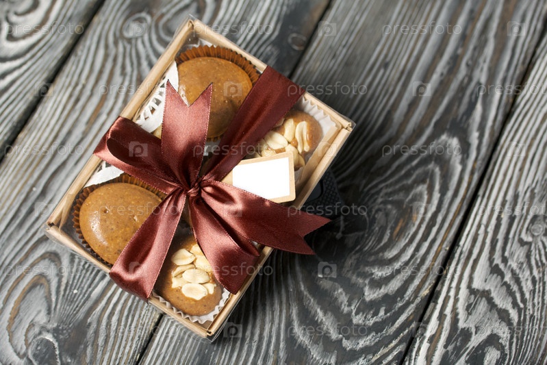 Карамель домашняя. Коричневые карамельные конфеты. Сливочные конфеты с арахисом. На сосновых досках. Упаковано в коробку и перевязано лентой