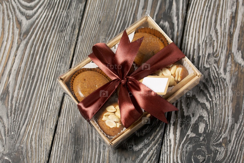 Карамель домашняя. Коричневые карамельные конфеты. Сливочные конфеты с арахисом. На сосновых досках. Упаковано в коробку и перевязано лентой