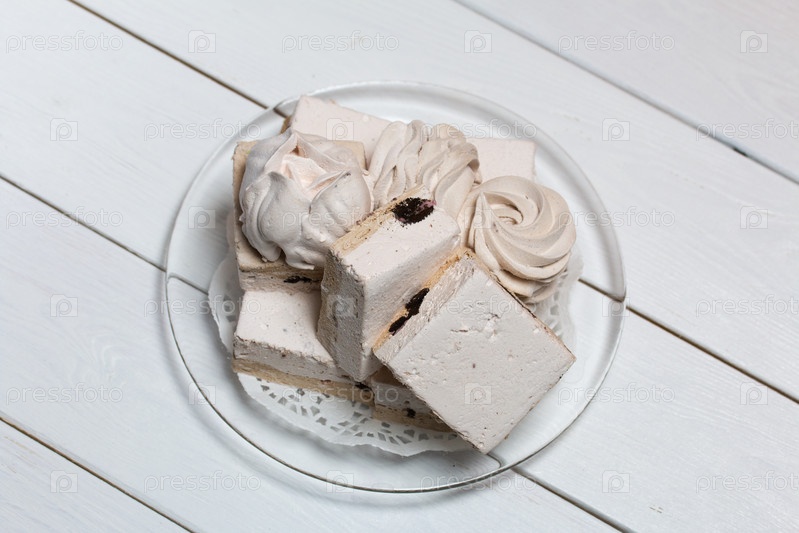 Домашний зефир на подносе. На белом фоне. Крупный план