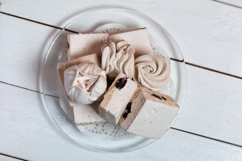Домашний зефир на подносе. На белом фоне. Крупный план
