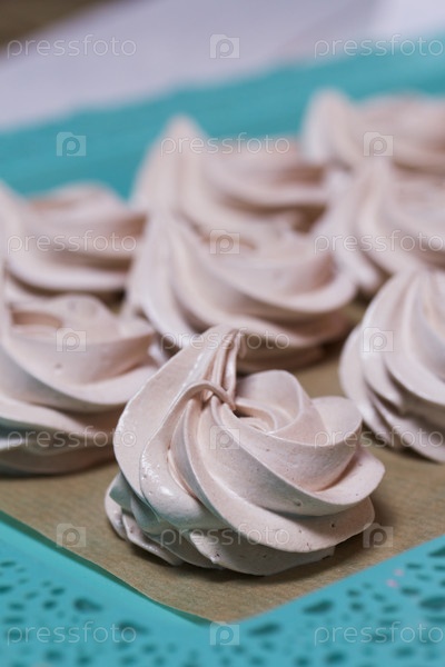 Домашний зефир сухой на подносе. На белом фоне. Крупный план