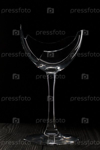 Разбитый стеклянный кубок. Стоит на черных досках. Снято на черном фоне