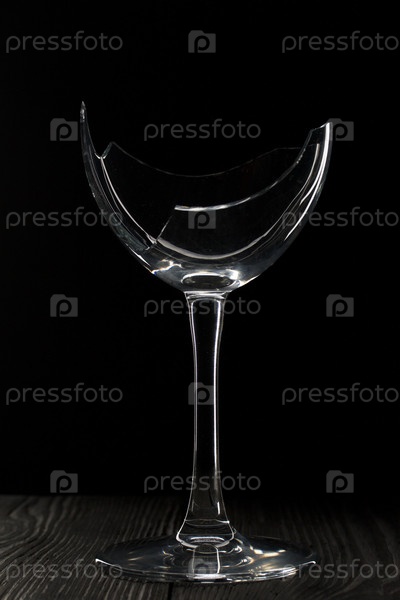 Разбитый стеклянный кубок. Стоит на черных досках. Снято на черном фоне