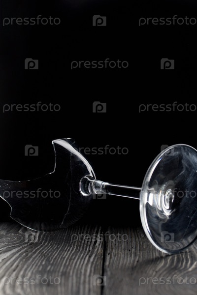 Разбитый стеклянный кубок. Лежит на черных досках. Снято на черном фоне