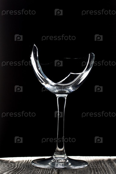 Разбитый стеклянный кубок. Стоит на черных досках. Снято на черном фоне