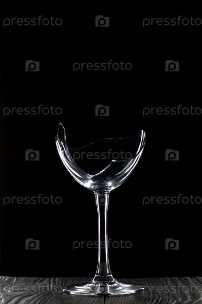 Разбитый стеклянный кубок. Стоит на черных досках. Снято на черном фоне