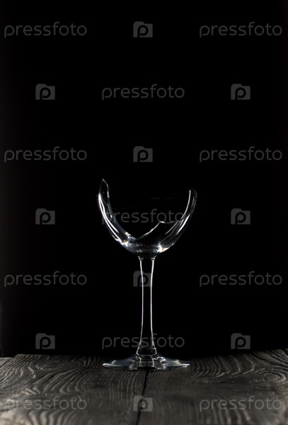 Разбитый стеклянный кубок. Стоит на черных досках. Снято на черном фоне