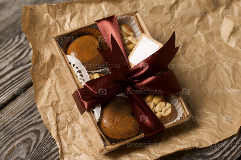 Карамель домашняя. Коричневые карамельные конфеты. Сливочные конфеты с арахисом. На сосновых досках. Упаковано в коробку и перевязано лентой
