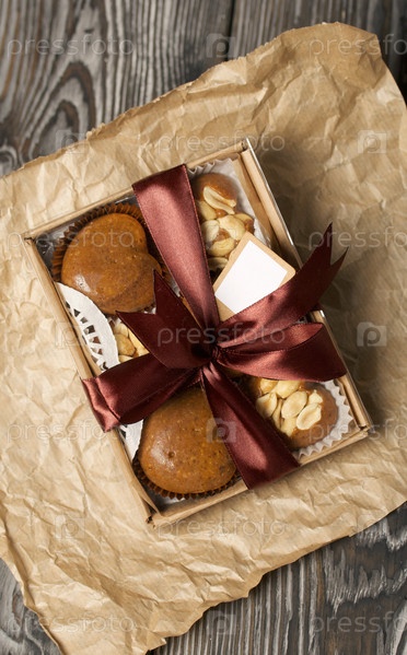 Карамель домашняя. Коричневые карамельные конфеты. Сливочные конфеты с арахисом. На сосновых досках. Упаковано в коробку и перевязано лентой