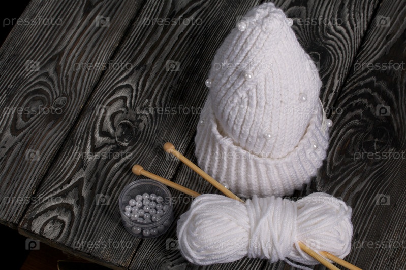 Вязаный шарф белого цвета. Женская вязаная одежда ручной работы. Рядом лежит моток белых ниток для вязания и спицы. На черных досках