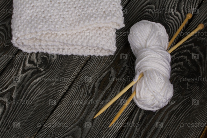 Вязаный шарф белого цвета. Женская вязаная одежда ручной работы. Рядом лежит моток белых ниток для вязания и спицы. На черных досках