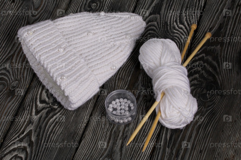 Вязаный шарф белого цвета. Женская вязаная одежда ручной работы. Рядом лежит моток белых ниток для вязания и спицы. На черных досках