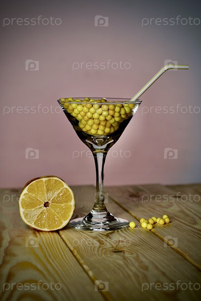 Бокал мартини с витамином С в виде драже. С трубочкой для питья. Рядом лежит нарезанный лимон и разбросаны несколько драже. Стекло стоит на сосновых досках