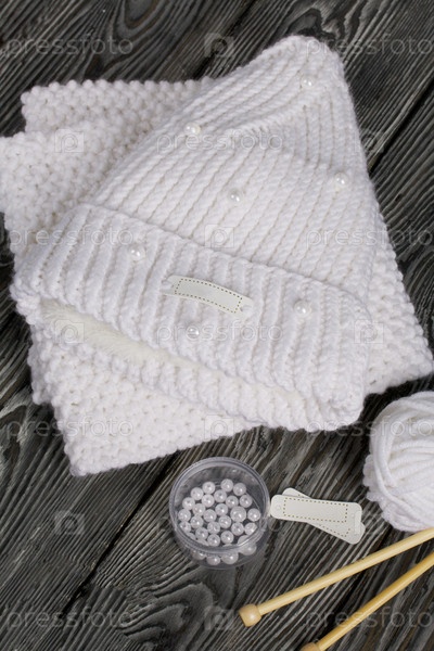 Вязаная шапка и шарф белого цвета. Женская вязаная одежда ручной работы. Рядом лежит моток белых ниток для вязания и спицы. Бусины для украшения в контейнере. На черных досках