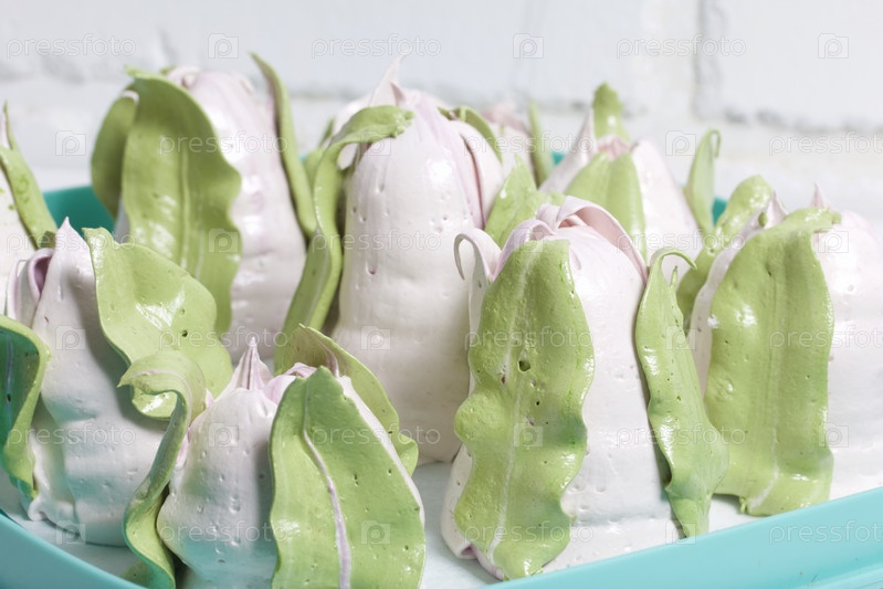 Домашние зефирные тюльпаны сушат на подносе. На белом фоне. Крупный план