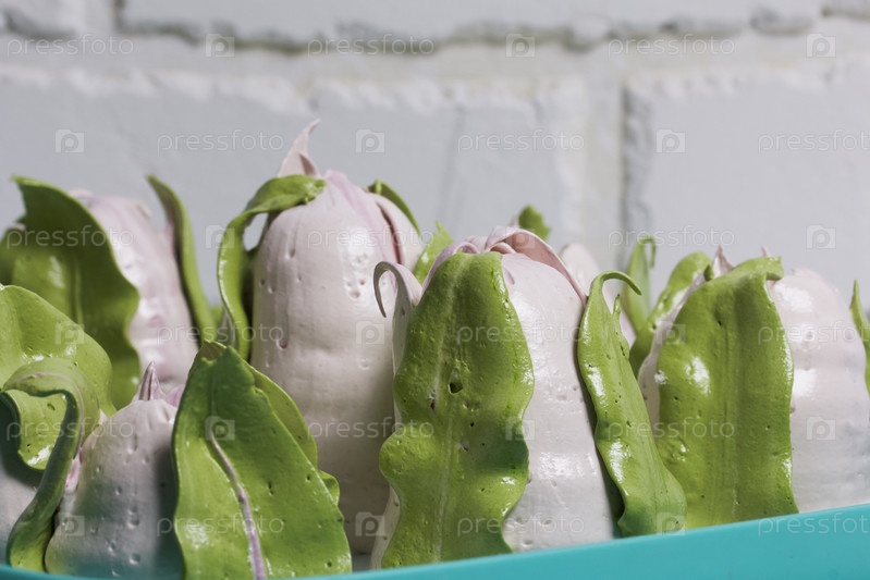 Домашние зефирные тюльпаны сушат на подносе. На белом фоне. Крупный план
