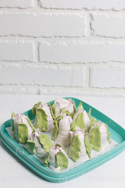 Домашние зефирные тюльпаны сушат на подносе. На белом фоне