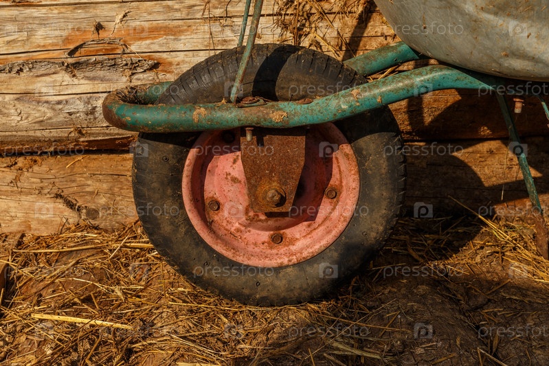 Крупный план ржавого колеса тачки. садовая тележка стоит у стены сарая