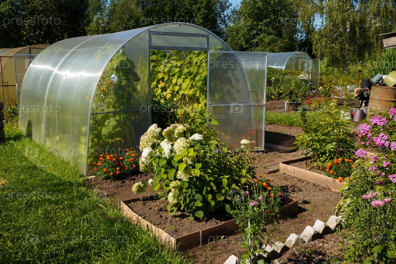 Теплица из поликарбоната в саду. Теплица с открытой дверью в огороде в солнечный день