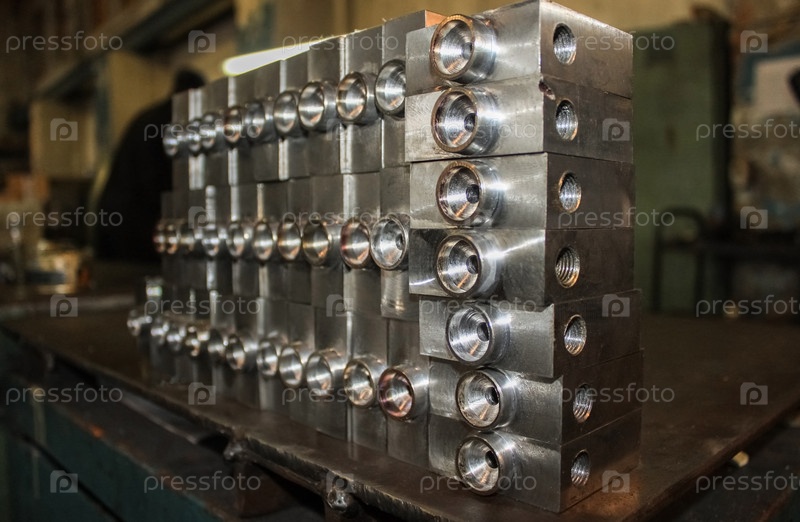 Стопка блестящих гидравлических клапанов в производственном цехе