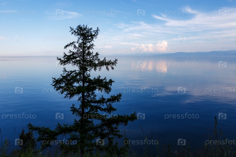Озеро Байкал. Одинокое дерево на фоне озера. Вечерний пейзаж. Россия