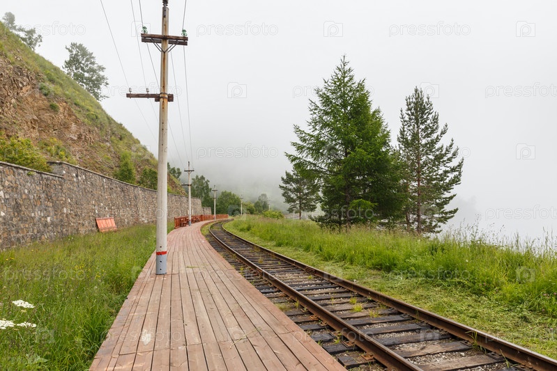 Деревянная платформа. Остановочный пункт на 102 км Кругобайкальской железной дороги. Озеро Байкал, Россия