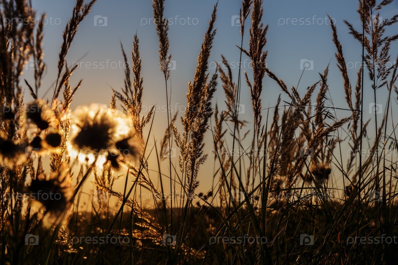Дикая трава в природе на фоне заката. силуэт травы на фоне заката
