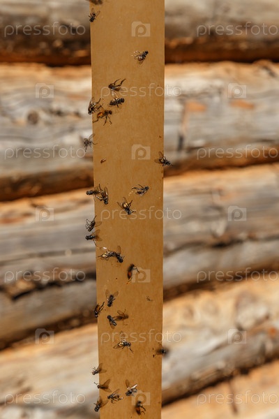 Липучка. Мухи, приклеенные клейкой лентой на фоне бревенчатой стены