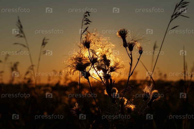 Дикая трава в природе на фоне заката. силуэт травы на фоне заката