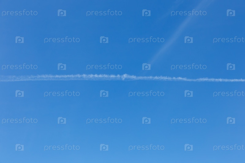 Белый след от самолета на фоне голубого неба. след, оставленный самолетом в небе