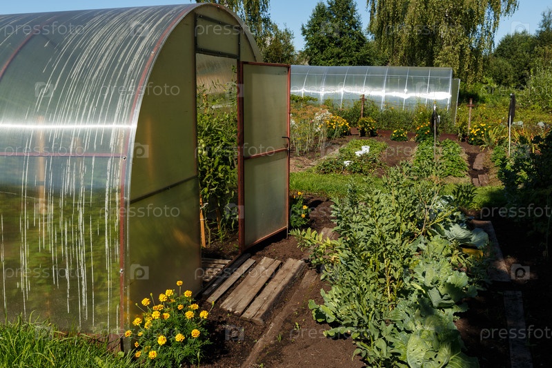 Теплица из поликарбоната в саду. Теплица с открытой дверью в огороде