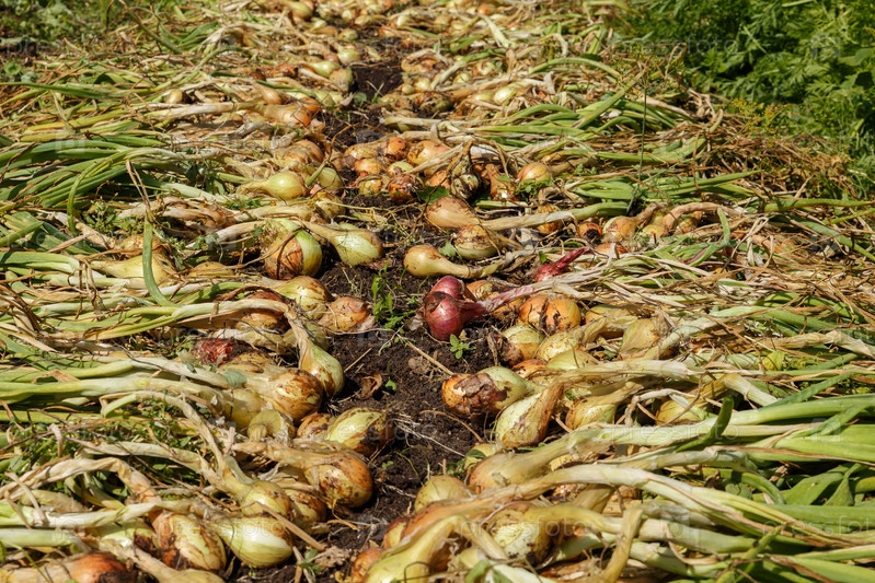 Урожай лука. Свежесобранный органический лук, выложенный для естественной сушки в огороде