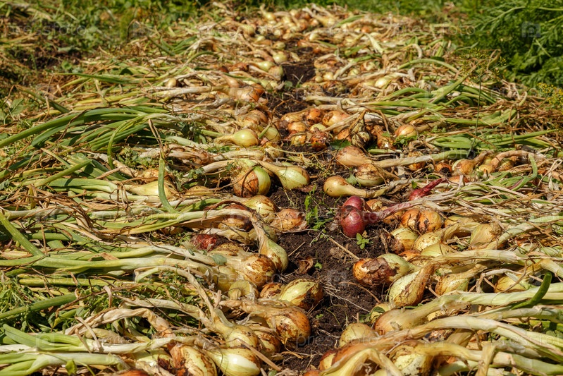 Урожай лука. Свежесобранный органический лук, выложенный для естественной сушки в огороде. С корнями, луковицами и еще зелеными листьями