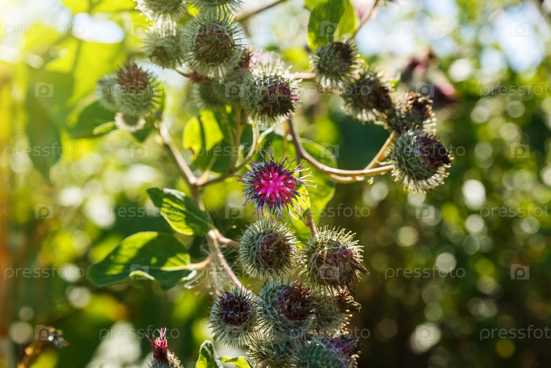 Arctium lappa обычно называют большим лопухом.Цветущие цветы лопуха на естественном фоне растений