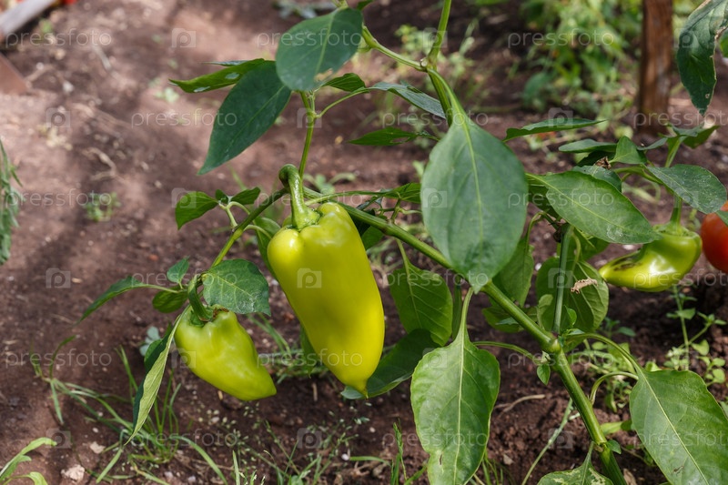 Болгарский перец в теплице. Зеленый болгарский перец висит на ветке