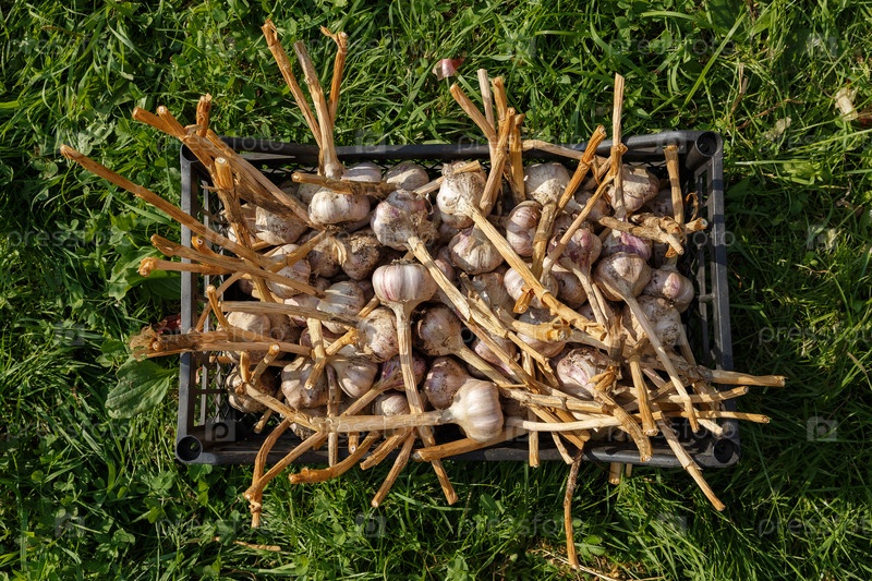 Урожай чеснока в пластиковой коробке. Свежий органический чеснок в черном контейнере на зеленой траве. Вид сверху