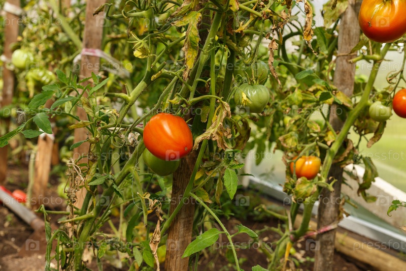 Красные помидоры, растущие в теплице. помидор висит на ветке